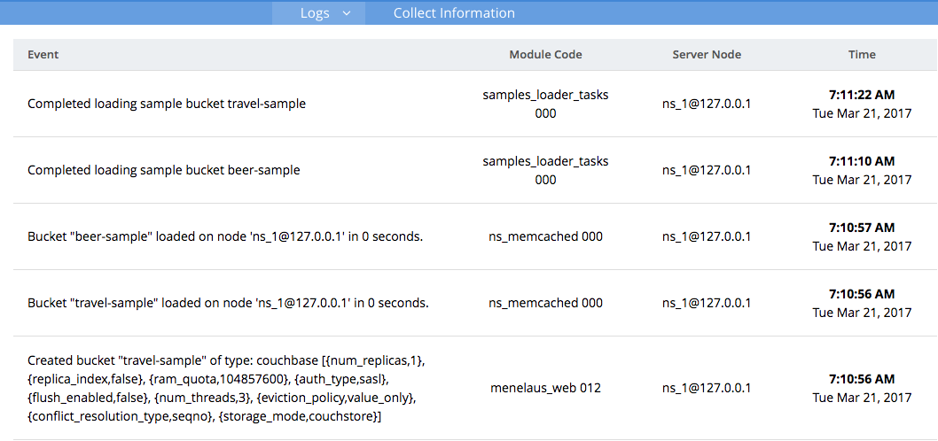 The Couchbase-Server Logging facility records important events, and saves the details to log files, on disk. Additionally, events of cluster-wide significance are displayed on the Logs screen, in Couchbase Web Console. This may appear as follows: