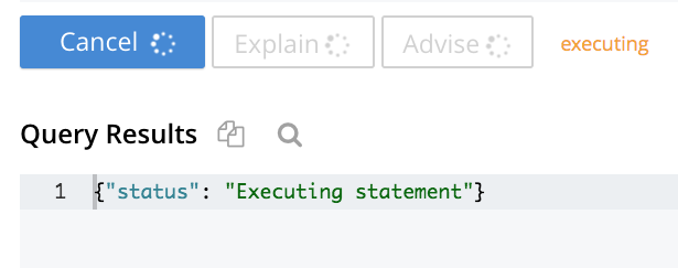 Couchbase Web Console now provides feedback on the ongoing execution of the query, to the right of the buttons. When query-execution has concluded, the results are duly displayed: