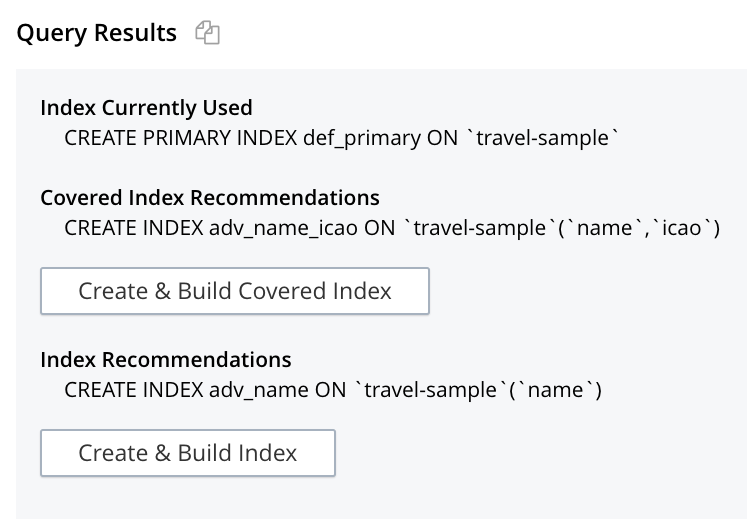 For example, type the following query into the Query Editor: SELECT icao FROM `travel-sample` WHERE name = "SeaPort Airlines";.