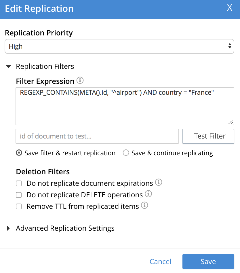 Once established, an XDCR filter — along with Replication Priority and Advanced Replication Settings — can be edited.